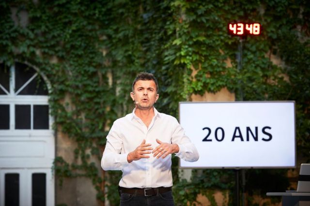 Comme en 2015, Frédéric Ferrer commence son spectacle avec des chiffres, des phrases de powerpoint visibles en gros caractères sur des écrans et qu’il fait avancer comme pour une conférence sur le sujet…