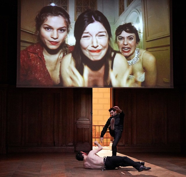 Très peu de décors et d’accessoires sur scène si ce ne sont quelques caméras qui nous permettent soit d’entrer dans l’intimité du jeu du comédien par un plan rapproché, soit de suivre une scène de meurtre se déroulant en dehors de la salle. Etrange sensation pour le spectateur qui devient un « monstre voyeur » l’espace d’un instant.