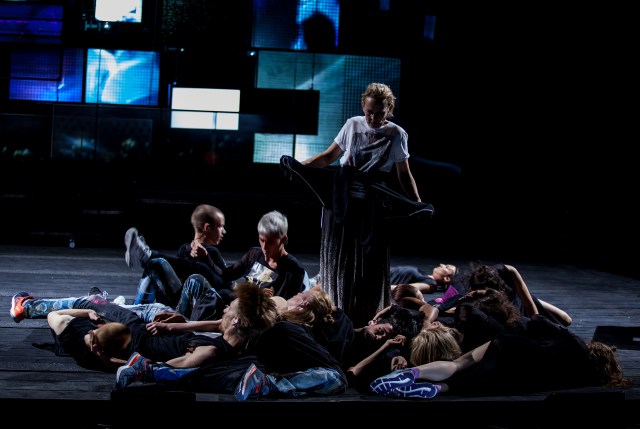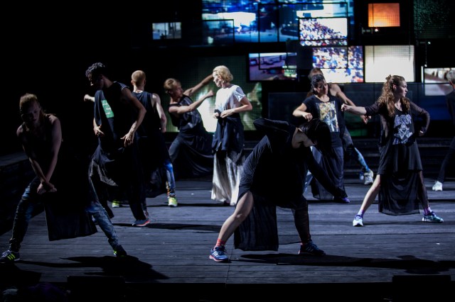 Ambitieux projet que celui du metteur en scène belge-flamand de co-construire un objet artistique mêlant les ressources du saisissant texte polyphonique d’Elfriede Jelinek et la plasticité chorégraphiée des danseurs de Maud Le Pladec, l’une et l’autre de ces deux sources valant à coup sûr estampilles de qualité. Ainsi réunis sur un même plateau, « Les Suppliants » de l’écrivaine autrichienne Prix Nobel de littérature 2004, pris en charge par quatre acteurs munis de caméras sonorisées commentant en direct, à la manière d’un chœur grec, les pensées mêlées de migrants et d’Européens, résonnent avec les corps de seize danseurs évoquant « les héros » des odyssées contemporaines. Venant de l’univers des arts graphiques, Guy Cassiers s’appuie à dessein sur les correspondances visuelles et sonores entre ces deux arts pour les mettre en tension afin de dire le drame humain des nouveaux naufragés, poussés à affronter les périls des grandes traversées maritimes afin de rejoindre la terre promise par Europe.