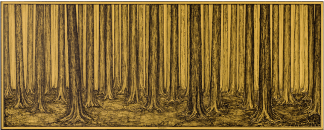 Avec la série des Water Washed Paintings, Ni Youyu a développé une technique utilisant un processus pictural particulier. Il recouvre préalablement ses toiles d’acrylique doré puis de couches noires. Il pulvérise ensuite une très grande quantité d’eau afin d’éliminer différentes strates jusqu’à ce qu’il ne reste plus que les contours précis d’un dessin. L’eau devient ainsi un second pinceau. Ces toiles contrastées présentent des motifs évoquant des éléments naturels, comme des arbres ou des forêts, mais également des sédiments fluviaux et des rivières. Les Water Washed Paintings, tout comme les gravures sur bois également présentées dans l’exposition, sont souvent peintes dans un cadre baroque en référence aux chefs d’œuvres classiques. Ce processus de délavage semble annihiler le temps :