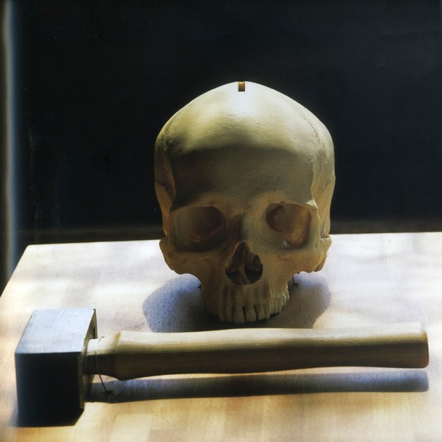 Philippe Ramette, Vanité N°I, 2002, Technique mixte : crâne en plastique, marteau, socle en bois et vitrine en plexiglas (détail) I Socle : 110 x 48 x 37 cm