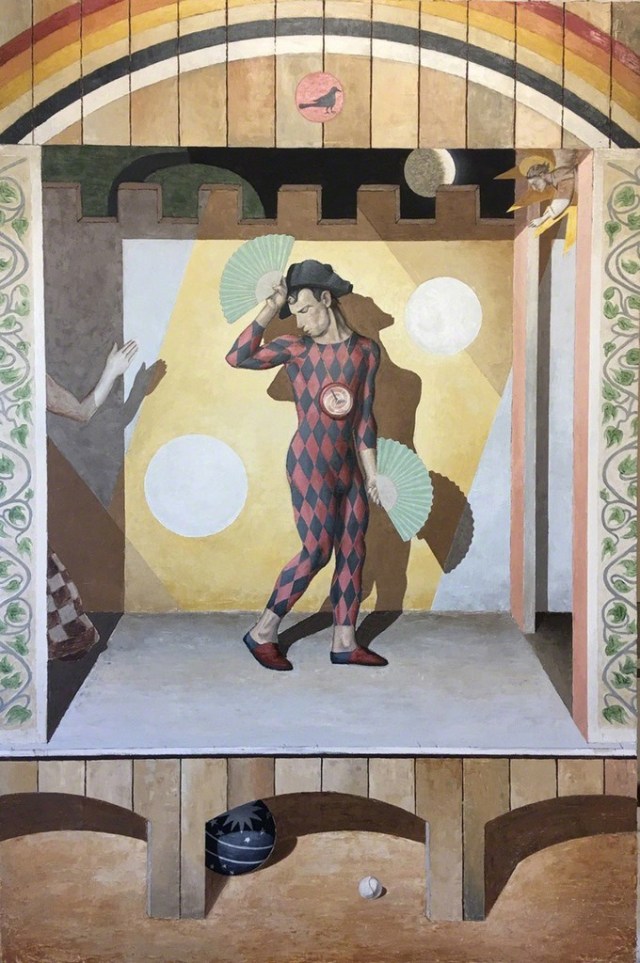 Les peintures de Christian Hidaka fonctionnent par condensation d’inspirations. Il y a les théâtres de Fludd bien sûr, mais on retrouve aussi le Trecento italien dans ces pavements redressés, ces spatialités closes, ces couleurs pâles et mates comme celles des fresques. On pense aussi aux images de carnaval, aux peintres de Venise, aux masques de Pietro Longhi. En d’autres instants, on se demande si ces jeux d’éventails et ces fonds pareils à des toiles peintes ne feraient pas allusion au théâtre nô. Puis, on est frappé par la parenté entre le jeu vidéo et cet univers où le volume est construit par accentuation du plan, où les personnages échangent leurs combinaisons et leurs accessoires, à l’image des protagonistes que le gamer habille et équipe à sa guise. L’étrangeté de ce monde est pareille aux images de mémoire : elle ne peut être déchiffrée que par celui qui la compose.