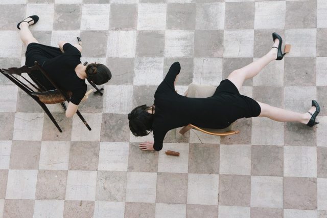 Quant à « A String Section » réunissant – pour sa première française – dans l’espace public bordelais (Jardin Public et Miroir d’eau) ou encore entre les murs du prestigieux CAPC (Musée d’Art Contemporain) cinq performeuses des Reckless Sleepers, il a étonné brillamment le public jusqu’à créer une symbiose empathique avec les cinq jeunes femmes en « petite robe noire » et escarpins, usant chacune de leur instrument – une scie égoïne très affutée – pour scier les chaises sur lesquelles elles avaient sagement pris place. Face à un public médusé par tant d’expertise équilibriste, en gardant une posture toujours digne malgré les contorsions improbables de leurs exploits physiques aux limites de l’impossible, elles ont fait corps triomphalement avec l’objet de leur désir (la chaise qui leur sert d’assise) tout en le massacrant religieusement de leurs traits de scie appliqués.