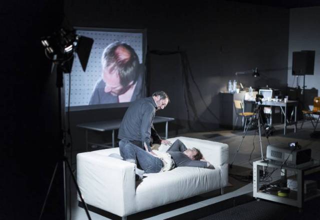 La structure scénographique envisagée par Jan Versweyveld forme une sorte de boite, d’installation : quelques sièges de théâtre posés à cour et un sofa à jardin avec une caméra et une table basse.