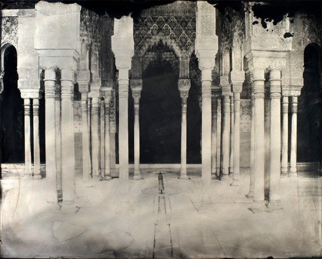 La recherche esthétique de Sergio Vega se propose de reconstruire la mémoire de ce deuxième voyage, en replaçant son regard dans l’espace architectural du site. Pour se faire, Vega recourt à une technique photographique originelle : le ferrotype. La plaque de métal est imbibée d’une solution photosensible qui, au contact de la lumière, fige l’image pour toujours. Le rendu presque aqueux de ces trente photographies sur plaque d’aluminium, crée des images fantasmagoriques d’un regard perdu dans les saisons de l’esprit. Les détails de l’architecture de l’Alhambra — organisée selon des principes mathématiques stricts — sortent de la lumière crépusculaire comme des épiphanies.