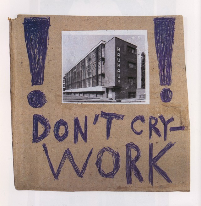 « C’est le nom générique pour tous ces travaux que je fais depuis un an sur des bouts de carton. Ce sont, contrairement aux Fifty-fifty ou aux Moins, qui eux aussi peuvent être faits sur carton mais aussi sur d’autres matériaux, des travaux qui sont directement inspirés des pancartes que je vois dans la rue, dans le métro, des cartons faits par des gens dans un besoin existentiel et qui recourent à ce moyen économique, efficace, beau. Ces pancartes me plaisent parce que leurs auteurs n’ont pas de souci d’esthétique ou de mise en page. Seul leur importe de faire passer leur message pour recueillir ce qu’ils demandent. Ils sont beaux parce que le terme de l’engagement se croise avec le terme de la sincérité […]