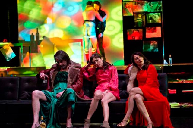 Le plateau est divisé en plusieurs espaces scéniques, dont le principal offre au regard un énorme canapé en Skye et un tapis blanc à longs poils. Sur cet espace principal divers écrans et autour de plus petits espaces viendront accueillir différentes scènes. Nous y retrouvons, comme accessoire, le bon vieux petit écran sans télécommande et muni d’une antenne. Le décor, les accessoires tout rappelle l’œuvre de Fassbinder. Les références aux années 70 s’accumulent : le tapis en poil long et blanc, les tapisseries à motifs énormes et souvent psychédéliques, les pochettes de trente trois tours jonchant l’avant-scène. Les costumes des comédiens aussi, tout comme le décor, s’inscrivent dans la droite lignée des films de Fassbinder puisqu’ils sont la réplique exacte de ceux des personnages des films. Les scènes jouées sur le plateau sont parfois filmées et retransmises en direct telle une mise en abîme théâtrale, ou scénique, ou bien des écrans, dont l’un immense au centre, projettent des extraits de films de Fassbinder comme autant de références, autant de palimpsestes.