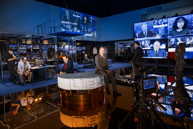 Adapté du film par Lee Hall, la mise en scène d’Ivo Van Hove offre ici une fabuleuse expérience au spectateur tout en conservant l’aspect prophétique du scénario. Tout est ainsi conçu pour le dérouter. Reprenant les grands aspects de l’intrigue, il l’actualise. Des spectateurs placés sur l’immense plateau dinent, rappelant la cour française au XVIIe sur scène, des écrans disséminés sur le plateau reflètent diverses images de la scène mais aussi mêlent années 70 publicités, et figures actuelles politiques, dont un géant en fond de scène, sur lequel se tient une partie de l’équipe technique, au centre un plateau type journal télévisé en rond de UBS, l’avant-scène se prolonge jusque dans le public et permet une avancée au sein des spectateurs, à l’image d’Howard Beale touchant des millions de personnes, ou de n’importe quel réseau social actuel, côté jardin, une salle entièrement vitrée, se métamorphose en loge ou salle de presse. Une fois encore une magnifique scénographie signée Jan Versweyveld qui, contrairement à d’autres mises en scène d’Ivo Van Hove comme celle d’Obsession que je n’ai pas chroniquée tant elle m’a déplue, ou encore celle d’Hedda Gabler, semble fonctionner et totalement justifiée.