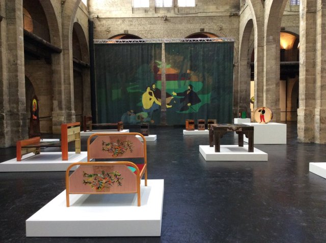 Elle continue à nous guider à travers ses œuvres, en commentant ce meuble vestiaire trouvé chez son père et « emprunté » pour insérer à l’endroit de la glace initiale un portrait de sa Joconde à elle. A ses côtés, un lit avec sa radio intégrée à la tête, objet éminemment populaire trouvé à la brocante, devient le support d’un email sur plaque de métal représentant La muerte del pecador. Plus loin, c’est une table chinée qui devient le cadre d’un email sur plaque de métal, Naturaleza mesa viva. A chaque support, le même trait apparemment naïf et débordant de vitalité colorée contenue. Tables de nuit et autres objets comme un tambour deviennent encore les supports détournés de ses productions iconographiques.