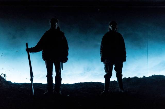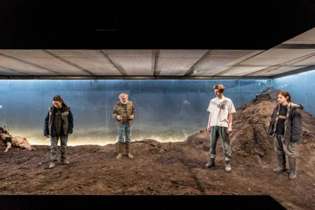 Le Jerwood upstairs est une salle étonnante par sa capacité de métamorphose. « Gundog » écrit par Simon Longman n’échappe pas à la règle. Dans une scénographie sombre où des pans entiers de terre boueuse sont installés sur le plateau avec, en fond, des murs vitrés, remplis de fumée et aux lumières bleutés, et violacées nuancées de volutes de fumée, qui s’insinuent également sur le plateau, la virtuose Chloé Lamford, installe d’emblée une ambiance glaciale et montre l’isolement de cette famille modeste qui tente de survivre.