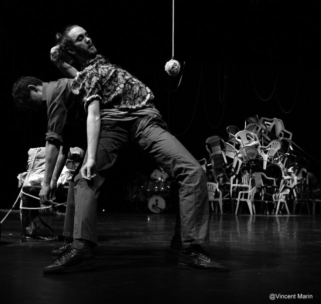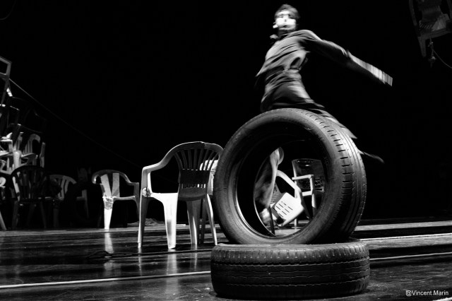 Anne Le Batard : C’est un travail mené en parallèle, un diptyque avec « Paradise » pièce pensée pour l’extérieur alors que « Paradise is not enough » a été construite pour le plateau, pour la boîte noire. Le plateau est devenu un enjeu avec cette création. Par habitude, notre travail in situ ne nécessite aucune transposition et tous ces « endroits scénographiques urbains » que nous découvrons, à pied, appareil photo en main, un peu partout sur la planète sont notre seule matière. Le plateau a confirmé la nécessité si ce n’est le besoin de composer avec des objets certes simples puisque tellement communs (chaises en plastique, cordes, pneu NDLR) mais ce sont ces objets qui construisent ces espaces de vie des pays du sud où le rien devient royaume.
