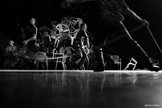 Pour ce qui est de la construction scénographique de « Paradise is not enough », c’est surtout Jean-Antoine qui a construit, composé le plateau et tout particulièrement l’assemblage des chaises. Cette installation ressemble à un vrai « Légo » délicieusement enfantin et pourtant parfaitement assemblé, équilibré.