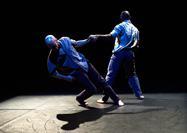 Cet ensemble de petites formes, comme toujours chez Maliphant, fait reconsidérer le corps du danseur à l’oeuvre qui se déploie, se déforme, est sublimé par l’emploi particulier de lumières sur le plateau. L’espace et la nudité un peu crue et décrépit du théâtre Coronet, non sans rappeler le charme suranné du Theâtre des Bouffes du Nord à Paris, avec ses vestiges de moulures et autres anciens stucs laissés à nu et dont le temps marque les rides, confère aux différentes pièces une proximité, une intimité singulière dans le rapport au corps du danseur. Sur une scène semblable à une arène ou une fosse, apparaît des jeux de lumière, parfois figuratifs, au sol de ce plateau dépouillé pour ces trois premières petites formes. La première pièce, reprise de Critical Mass, un duo composé de Russell Maliphant et Dickson Mbi, repose sur un jeu de mouvements répétitifs et pourtant très fluides, repris en synchronisation, puis destructurés et en disharmonie sur une musique aux accents presque pop. L’éclairage bleuté profond distend les mouvements ainsi que la quasi pénombre dans laquelle les danseurs évoluent crée comme une synesthésie du corps en mouvement. Décomposition, répétitions, entrelacs hypnotiques, le duo se meut en deux reflets l’un de l’autre, ils sont d’ailleurs vêtus de la même manière.
