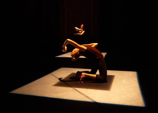 La seconde petite forme, Two times two, dévoile progressivement deux danseuses, Dana Fouras et dans un clair-obscur doré ce qui permet d’en souligner les mouvements rapides et par un jeu d’optique de leur recréer de nouveaux corps des ailes se dessinant dans les gestuelles de bras, les contours de leurs corps se brouillant. Côte à côte et pourtant Dana Fouras et Grace Jabbari dansent comme en deux solos qui se rejoignent se décalent baignées de cette lumière orangée et évoluant chacune dans un petit espace carré de lumière qui se profile sur le sol de la scène. Poétique. Beau. Envoûtant.
