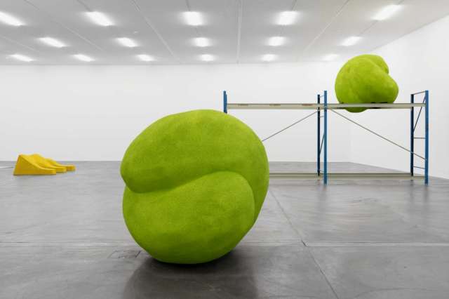 On the other side, the sheer size of the sculptures—which, based on Lena Henke’s height, was determined with the help of Le Corbusier’s Modulor—presents them to the visitors as a human counterpart. The hollow core of these figures is sprayed with a soft rubber granulate normally used for flooring on athletic fields or playgrounds. With their bare materiality, Henke’s objects surely travesty the verticality and solidity of sculpture. Like Lynda Benglis’s latex works from the 1970s, which were poured on the floor, Henke’s artworks thus absorb horizontality as a negation of sculpture. Unlike such historical examples, however, they do not seem to want to transcend or destroy its identity. They do not take part in any illusions of progress. The figure of Aldo Rossi’s Sleeping Elephant emblematically takes this tension to the extreme: its form can be read both as an animal lying on the ground and as an overturned sequence of architectural arches. The elephant’s sleep is simultaneously the allegorical sleep of modern sculpture itself and the dream of its utopian realization as architecture. Another form rolls through the room as Ayşe Erkmen’s Endless Knee. As two entangled legs concealing the crotch, it turns to stand up to the masculine dream and suspends it for a time.