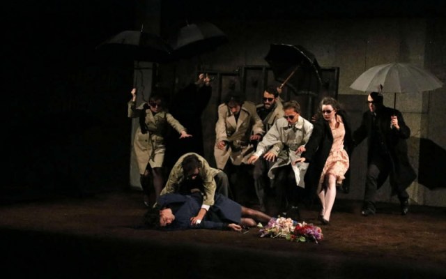 Avec un cynisme souvent grinçant, une intelligence insolente qui n’épargne aucune personnalité de cette époque, au titre desquelles figurent le représentant du SPD (Parti Social-Démocrate Allemand) Helmut Schmidt, mais aussi Dany Le Rouge, ou encore un certain Frédéric Mitterrand, les aèdes contemporains rendent compte non sans un humour dévastateur des postures de chacun. Viennent ensuite les funérailles de RWF qui donnent lieu à de splendides tableaux vivants, de corps distordus sous l’effet du vent qui souffle en rafales, de la pluie qui s’abat (magnifique chorégraphie de parapluies tenus à bout de bras) et de la douleur qui distord les traits de ceux qui restent, orphelins d’un combat plus grand qu’eux. Palettes de couleurs, de lumières et de mouvements orchestrés à rendre jaloux peintres et chorégraphes.