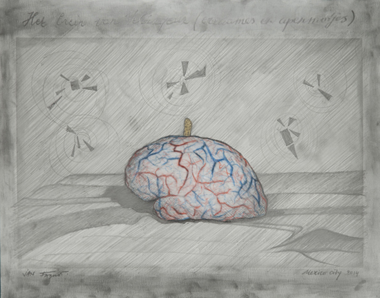 Images: Jan Fabre, 1&2 : Gisant (Hommage à Elizabeth Caroline Crosby) marbre blanc de carrare 2012 / 3- The brain of Velazquez (maids of honour and monkey nuts), 2014. Crayon HB, crayon de couleur sur papier photo, 24 x 30.5 cm. / 4-Gisant (The Liebestod of the brain), 2012. Marbre blanc de Carrare / 5- Homage to Stephen Hawking, 2007 (Series : Brain models) / © Adagp Paris 2018. Photos © Carlotta Manaigo & DR.