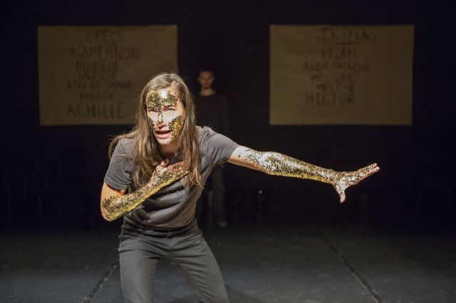 Pauline Bayle surfe allègrement sur la vague de « facilités » offertes par l’époque, tant au niveau scénographique, de la distribution des rôles que du discours pour justifier son parti-pris de casser les attendus. Une scénographie dépouillée à l’extrême (quelques seaux d’hémoglobine de synthèse, quelques chaises, de la farine, des paillettes, trois fois rien selon les revendications d’un Théâtre Pauvre ici dévoyé, Cf. Jerzy Grotowski), une distribution des rôles volontairement indistincte (hommes jouant des femmes et vice versa), et discours rôdé pour relier cette « liberté prise » à la volonté assumée de casser les clichés identitaires assignant les hommes et les femmes à une place désignée socialement ou encore pour relier cette histoire vieille de plus de trois millénaires à celle de l’Europe actuelle toujours en proie à des conflits.
