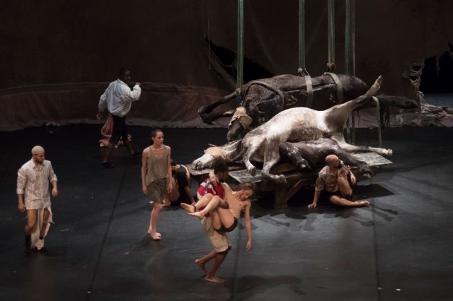 Sur le plateau, la sculpture expressionniste de trois chevaux monumentaux enchevêtrés les uns aux autres et gisant sur le flanc – œuvre de la plasticienne Berlinde De Bruyckere – semble être posée là pour réveiller nos consciences endormies, rappel subliminal du titre allemand – nicht schlafen – « ne pas dormir ». En faisant ainsi écho aux bêtes éventrées lors des charges de boucherie héroïque de la cavalerie de la première guerre, l’installation sculpturale réifie la violence guerrière des hommes se détachant sur fond d’une gigantesque toile marronnasse trouée – comme l’Histoire peut l’être – par les effractions de la bestialité pointant son nez sous le vernis culturel policé tendu au regard. Autour de ce « des-corps » porteur d’une inquiétante étrangeté – la mort est là qui rôde – neuf danseurs, huit hommes et une femme, vont se confronter les uns aux autres, sous forme de duos à fleur de peau ou de groupe compact, dans un chaos apparemment inorganisé loin de toute synchronisation esthétisante. En effet pour dire l’extrême violence des rapports en milieux humains, Alain Platel ne pouvait décemment choisir l’harmonie d’une chorégraphie huilée, seule l’énergie désordonnée de contacts abrupts, de corps à corps primitifs, était « de nature » à exprimer l’instinct de (sur)vie à l’œuvre.