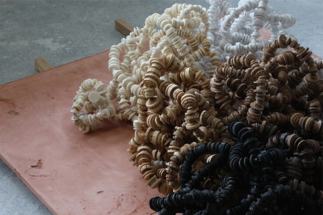 À l’inverse, au cours de sa résidence pantinoise, les objets à portée de main étaient à la fois précieux et ouvragés, de forme circulaire et le plus souvent destinés à être vus en deux dimensions une fois cousus. La gageure consistait donc désormais à les dépouiller de leur fonction. La contrainte, volontairement assignée par l’artiste, était alors de taille ; le matériau impliquant un changement d’échelle saisissant. L’artiste revisite ainsi ses gestes de sculpteur à une micro-échelle, n’hésitant pas à taillader, entailler, lacérer ou évider la matière sur de toutes petites surfaces.
