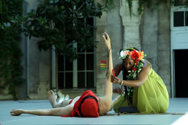 Autre ambiance avec cette « Invocation à la muse » qui voit Vanasay Khamphommala devenir un objet sexuel et sensuel de Caritia Abell, spécialiste de BDSM nous dit la notice du programme, en tous les cas, elle cache bien son jeu. Arrivée dans une robe verte transparente, elle se saisi de son partenaire qu’elle dessape en un clin d’œil pour lui faire subir tout un tas de sévices qui vont du pire – un bon coup de ceinturon à midi, ça fouette le sang ! – au meilleur avec force caresses de fleurs et autres attouchements… Baigné de mots, Vanasay Khamphommala, semble surpasser sa douleur et s’accommoder de son statut d’objet… On indique des tournées… pas sûr que midi soit la bonne heure pour une expérience que je verrais bien plus la nuit dans une cave que dans un jardin avec la vierge à laquelle cette année, malgré la nécessité, on n’a pas bandé les yeux. A ne pas mettre entre toutes les mains, donc.