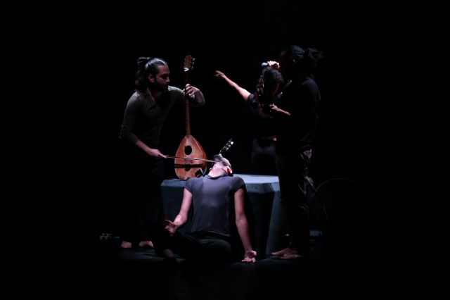 Les hommes balayent du regard chacun de nous. On entend au loin les psalmodies d’une femme qui conte en arabe plusieurs scène de vie. Elle surgit et entonne un chant. Par le truchement d’un passage au noir, procédé assez utilisé sur cette pièce pour marquer la fin d’une séquence, on retrouve les trois hommes sur scène, les deux musiciens autour d’Ali Chahrour qui à la tête renversée, le cou offert à l’archet du oud en action. Saisissante image.