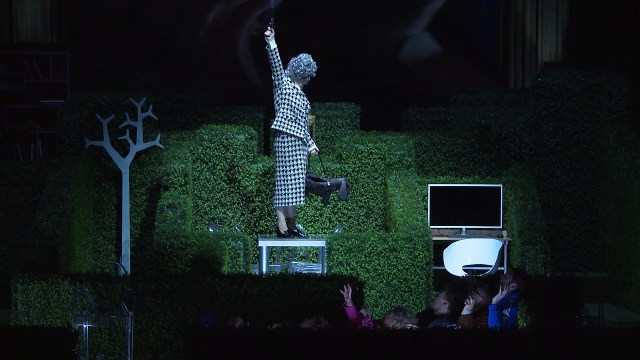 Dans la noirceur avignonnaise de cette édition du Festival, le metteur en scène Oskaras Koršunovas détonne avec son adaptation fluo et trash du Tartuffe de Molière. Ici point de dévot mais plutôt un politicien malin et populiste qui va tout prendre à Orgon. Scénographie efficace avec ce labyrinthe de verdure représentant la maison d’Orgon sur un plan incliné, tout devient alors très visible et permet un jeu de cache-cache entre acteurs souvent très drôle. Comme il est de mise dans ce festival, le metteur en scène cède à l’utilisation de la vidéo, mais ici de façon bien plus raisonnable. Le principe reste toutefois le même : montrer ce qu’on avait l’habitude d’imaginer au théâtre, comme s’il fallait, comme au cinéma ou la télé, prémâcher l’imagination des spectateurs devenus trop fainéants. Enfin soit ! Oskaras Koršunovas nous livre ici un Tartuffe à l’accent populiste, suivant ce courant à la mode qui déferle en Europe. Il fait tout pour convaincre et use de toutes les ruses, comme ce pelotage en règle des Orgon, homme et femme. Idée « géniale » qui culmine quand il embrasse goulument Orgon qui se laisse faire, comme hypnotisé.