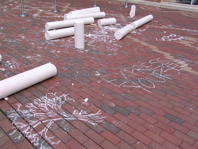 Based in Puerto Rico, collaborators Jennifer Allora (b. 1974) and Guillermo Calzadilla (b. 1971) create works that reach across sculpture, video, performance, and photography. Chalk (1998) is an ongoing art project in which the artists place human-size sticks of chalk—each piece measuring 64 inches in length—in public spaces for passers-by to use as they choose. Previously installed in Lima, Peru; Paris; Boston; and New York, the work takes on a new personal and political identity in each new location.