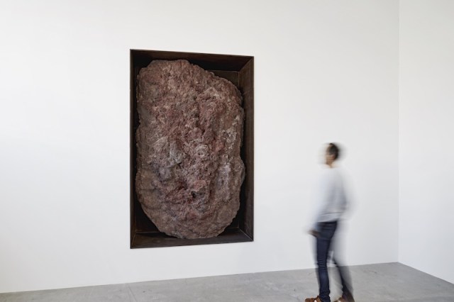 Scoria Negative Wall Sculpture (2016), une masse de roche vésiculaire sombre étroitement encastrée dans un cadre en acier profond, est installée à l’intérieur d’un mur adjacent de la galerie, reproduisant la configuration positive/négative de l’œuvre d’Heizer Displaced/Replaced Mass (1969).