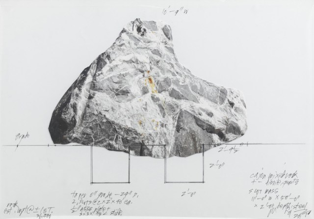 Les vitrines installées dans une première galerie contiennent des documents d’archives provenant des dossiers d’Heizer, notamment des collages originaux de photos. Étant donné que les premières itérations des œuvres d’ Heizer à la fin des années 1960 ont été conçues comme des installations temporaires et se sont détériorées par la suite, elles n’existent plus que dans des photographies et des croquis préparatoires. Servant de matériel contextuel au corpus monumental de l’œuvre d’Heizer, ces documents mettent en lumière l’évolution d’un artiste américain unique, des premières excavations dans le désert au projet en cours City, une vaste sculpture située dans le désert du centre du Nevada, sur lequel l’artiste travaille depuis maintenant près de cinquante ans.