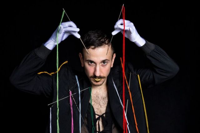 Sur le grand plateau de la salle Vitez du TnBA, des filins de laine incandescents multicolores, prolongés par des aiguilles, pendent fabuleusement des cieux découpant sur fond noir le danseur tout de noir vêtu, si ce n’est les chaussettes et les gants blancs ainsi que la lèvre inférieure rehaussée par un trait blanc. La magie visuelle de cette saisissante scénographie renvoie pleinement aux dons de plasticien du chorégraphe flamand. Dans le droit fil de cet environnement visuel propre à séduire le dernier des impies, la musique hypnotique créée par tambours, guitares basses et voix mises en écho que l’on doit à Dag Taeldeman, prédestine à accueillir en nous l’étonnant performer italien traversé de transes perpétuelles et souvent proche de l’extase.