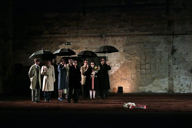 Avec un cynisme souvent grinçant, une intelligence insolente qui n’épargne aucune personnalité de cette époque, au titre desquelles figurent le représentant du SPD (Parti Social-Démocrate Allemand) Helmut Schmidt, mais aussi Dany Le Rouge, ou encore un certain Frédéric Mitterrand, les aèdes contemporains rendent compte non sans un humour dévastateur des postures de chacun. Viennent ensuite les funérailles de RWF qui donnent lieu à de splendides tableaux vivants, de corps distordus sous l’effet du vent qui souffle en rafales, de la pluie qui s’abat (magnifique chorégraphie de parapluies tenus à bout de bras) et de la douleur qui distord les traits de ceux qui restent, orphelins d’un combat plus grand qu’eux. Palettes de couleurs, de lumières et de mouvements orchestrés à rendre jaloux peintres et chorégraphes.
