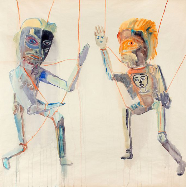 1- Ulla von Brandenburg, It Has A Golden Sun and An Elderly Grey Moon (Filmstill) 2017, Foto: Martin Argyroglo, Courtesy the artist / 2- Ulla von Brandenburg, « Marionetten“, 2017, Collage, Aquarell, Courtesy the artist