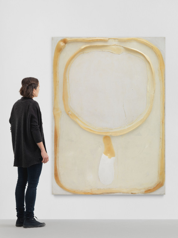 Image: Takesada Matsutani, Work-E. Two Circles, 1966, Vinyl adhesive, acrylic and oil on canvas, 183.5 x 133 cm / 72 1/4 x 52 3/8 in © Takesada Matsutani