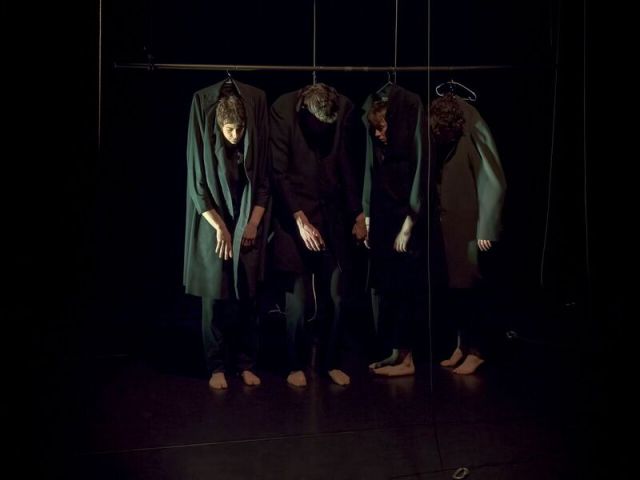 « La Chute des Anges » de Raphaëlle Boitel introduit d’emblée dans un espace-temps hors réalité, dans lequel les « humains » ne sont plus que des pantins aux gestes désarticulés. Se balançant accrochés à des cintres au rythme d’une musique répétitive, ils s’effondrent sur eux-mêmes, se relèvent vivement suivant les à-coups des filins qui guident leurs mouvements donnant à voir de très beaux tableaux de camaïeux de noirs dont la chorégraphe joue avec subtilité pour créer une atmosphère étrange convoquant celle des « outrenoirs » de Pierre Soulages. Lorsque l’un d’entre eux arrive à se délivrer de ses amarres en se défaisant du pardessus qui l’entrave, il est très vite rattaché au crochet suspendu par un semblable veillant à ce que l’ordre régnant ne soit aucunement perturbé par une initiative intempestive. Et lorsqu’ils parviennent à s’affranchir des fils qui les téléguident, faisant cette fois-ci « corps avec le sol », ils n’en perdent pas pour autant leurs démarches saccadées tant le conditionnement opère encore, même à distance. La musique s’affole tout comme les corps parcourant en tous sens le plateau, comme affolés par cette récente liberté qu’ils éprouvent.