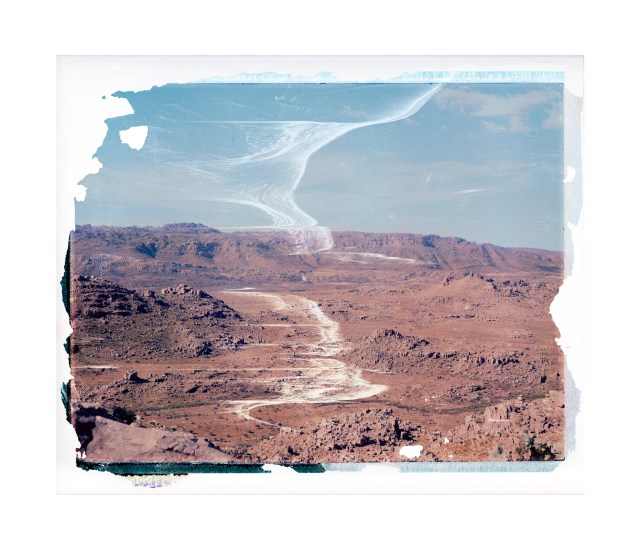 La série d’images réalisées suite à son voyage en Afrique du Sud présentent une texture, des marques blanches que l’artiste qualifie de « traces fantômes ». Celles-ci font écho à des aurores boréales, ces phénomènes naturels qui modifient le ciel. Ces effets provoqués durant le développement du négatif interagissent avec les caractéristiques des éléments naturels des paysages parcourus.