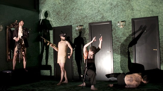 En n’offrant pas le texte en français directement, Arthur Nauzyciel nous oblige à lire les sur titrages qui nous permettent de comprendre la psychologie des personnages sans demander aux comédiens de la sur-jouer, c’est astucieux. Une sorte de tragédie s’installe donc. Sur ces immenses panneaux côté à côté, recouverts d’une photo du film Un chant d’amour de Genet qui précède le spectacle et devant ces portes de chambres, de ces pièces macabres, ces lieux de perdition, ces espaces qui permettent d’accéder au balcon ou l’on pourrait exhiber les corps… On retrouve dans cette pièce tous les thèmes et topics du poète maudit, ces images de traîtres comme le flic qui rejoint les gangsters. Ce lien trouble entre les hommes au moment de leur dernier souffle. Ce besoin de travestissement qui s’empare des personnages, de l’auteur qui ne manque pas de dénoncer les tapettes mais montre des hommes en femmes. A travers cette forme très cérébrale, « Splendid’s » fait son effet, car la chose est traitée avec sérieux et un sens du drame qui empli le spectacle. Il est aussi touchant d’y entendre la voix de Jeanne Moreau qui, avant de s’éteindre en juillet 2017, accomplit là son dernier acte de comédienne puisqu’elle est celle de la radio.