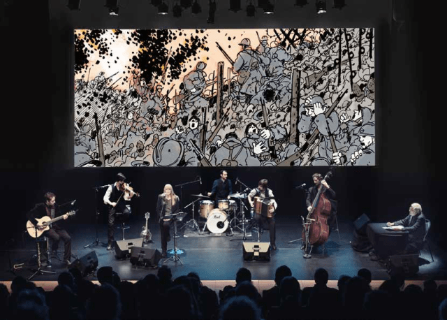 Le côté délibérément irrévérencieux du spectacle – ce pamphlet fort documenté contre la « boucherie héroïque » en est un, avec son tempo étudié et sa ligne dramatique – aux antipodes de la bonne conscience lénifiante dépasse l’aspect manifeste de certaines saillies. Ainsi du poing gauche levé sur scène de Dominique Grange pour ponctuer l’une de ses saisissantes chansons antimilitaristes. Ainsi de sa mention de l’interdiction lors des récentes commémorations de « La Chanson de Craonne » – chantée ce soir sur scène et censurée naguère par le commandement militaire, elle fut écrite dès le début de 1915 par des soldats révoltés – dont le refrain des plus explicites (Ceux qu’ont l’pognon, c’est pour eux qu’on crève. Mais c’est fini, car les trouffions Vont tous se mettre en grève. Ce s’ra votre tour, messieurs les gros, De monter sur l’plateau, Car si vous voulez la guerre, Payez-la de votre peau !) est répété à l’envi. Encore plus que ces événements, c’est l’extraordinaire force expressive des fabuleuses planches dessinées par Tardi et projetées sur écran géant qui constitue le fil rouge de la performance subversive.