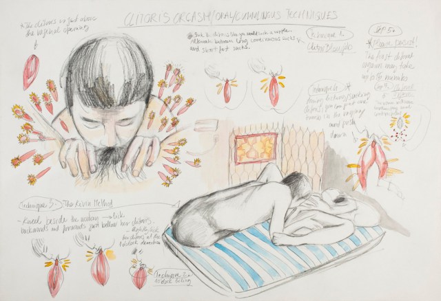 The principal characteristic of her work is an unswerving honesty with which she approaches the persons being depicted. Thus already in 2012 she began a special project: since she had no shower in her flat at that time, she had herself be invited to take a shower at other persons’ places of residence. In recompense, the owners of the respective showers could document her act of showering. For the next-to-last Manifesta in Zurich in 2016, she got together with a sex therapist and researched the female orgasm. After Andrea Eva Győri had created an intimate atmosphere of honesty, trust and pleasure, she made drawings of masturbating women who came into her space in order to share their sexual fantasies and experiences with her through their masturbation. Arising since then has been an abundance of drawings that first seem naive, but then prove to be a visually riveting collection of sexual motifs and practices which, freed from all taboos, issue a challenge to both male and female viewers.