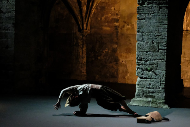 Lorsqu’arrive sur scène la première figure qu’a choisi d’incarner Francis Chaignaud, la Doncella guerrera, c’est un soldat casqué, vêtu d’un pantalon bouffant et les pieds nus, dévoilant autant de fragilité que de détermination qui danse son inclination guerrière. Une main tremblante à l’extrémité d’un corps résolu. Son chant, passant de la voix de tête aux accents graves d’une complainte de basse, accentue une tension déjà marquée par son corps, finissant arc-bouté, bien qu’effondré au sol.