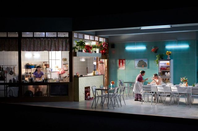 La scénographie servant de cadre à cette exposition d’existences aux identités flottantes entre deux continents, n’appartenant in fine à aucun puisque étant le fruit de l’héritage des deux, choisit un restaurant vietnamien, Le Saïgon, comme lieu de rencontres de ces vies éclatées. Le personnage central de ce restaurant traversé par les heurts et bonheurs liés à la vie comme elle va est la tenancière des lieux qui règne – elle se prénomme Marie-Antoinette, un nom prédestiné – sur sa cuisine en confectionnant ses sempiternels Cha Gio, Banh chung ou encore Pot-au-Pho (bel exemple culinaire de mixage de deux cultures ) et entretient avec chacun une relation des plus empathiques. « Son » restaurant elle l’a ouvert à Paris en 1956, après avoir dû abandonner celui de Saïgon – identique en tous points, d’où le même décor avec seulement des changements de lumières – en emportant avec elle l’inconsolable chagrin des départs qu’elle masque sous une énergie à toute épreuve.
