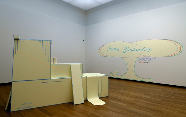 Lily Van Der Stokker: Yes that could be since communication is important for me. The text reflects on the being and the position of the artwork itself in the space, as if these artworks speak and think on the museum wall . They have an almost human vulnerability. They appear slightly dumb and have a calming effect that I like.