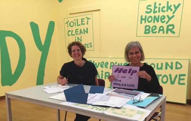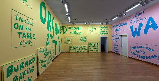 Lily Van Der Stokker: In 2014 I made a small object titled « Decent Tidy Kissy » (In the pink « Huh » Exhibition at Koenig & Clinton in New York) with on it a shelve displaying a roll of toilet paper. This work is for me a celebration of decency. This work inspired me to expand it into a larger and happy work on cleaning and organizing the household. All the text blocks in this large wall painting ‘Tidy Kitchen’ refer to experiences I had in my own household, like ‘a wooden spoon between the dishwasher door to dry the dishes’, or ‘pulling hairs out of the drain’, (yes who is doing that dirty work…). This artwork is an homage to all people, men and woman, who clean our houses. As a feminist I say that this is a celebration of cleaning. Housekeeping as subject matter for art. Also as I see it the work is opposing the romantic idea of the messy creative painter. So I consider this wallpainting to be an art-political work. The curator Anne Ellegood from the Hammer Museum called it ‘my most political work to date’ and compared it with Martha Rosler’s work the “Semiotics of the Kitchen”.
