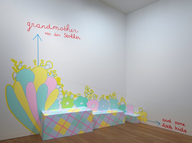 Lily Van Der Stokker: Five of the six rooms in the exhibition were organized on more or less chronological themes in my work from the past 30 years. Beginning with early work from the late eighties, “Questions/relaxing with art”, when I questioned as a young artist what art could be. I found out that I could make art from my mistakes, that artworks could be ugly, or sweet, and that with art I didn’t have to tell the truth, I could lie and cheat. In the whole exhibition I have put an undertone of a banal domesticity, like in the works about family, age and money. In the last and largest thematic room titled “Health Care”, I made two large wall paintings all in the same light yellow, with in it the names of my physiotherapists in New York and Amsterdam.