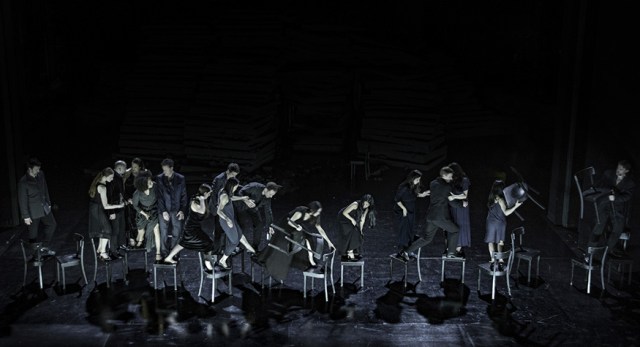 Dimitris Papaioannou le dit lui-même : « « Since she » est un hommage à Pina Bausch empli de nostalgie et de respect. » C’est cette nostalgie qui flotte sur un plateau faussement nu aux couleurs grises et noirâtres, sur lequel une pile de matelas gris forment une montagne au lointain, à cour des chaises de bar. Le spectacle débute, plein feux, avec l’entrée des danseurs sur des chaises agencées petit à petit, offrant ainsi une belle et lente traversée de plateau comme si le sol était inondé, impraticable. Les chaises identiques à celle de la célèbre pièce Café Müller de Pina Bausch, seront réutilisées durant toute la pièce avec pour point d’orgue l’équilibre tenu sur l’un des dossiers en début de spectacle puis en fin par l’un des danseurs avec sur l’assise la remarquable Breanna O’Mara.
