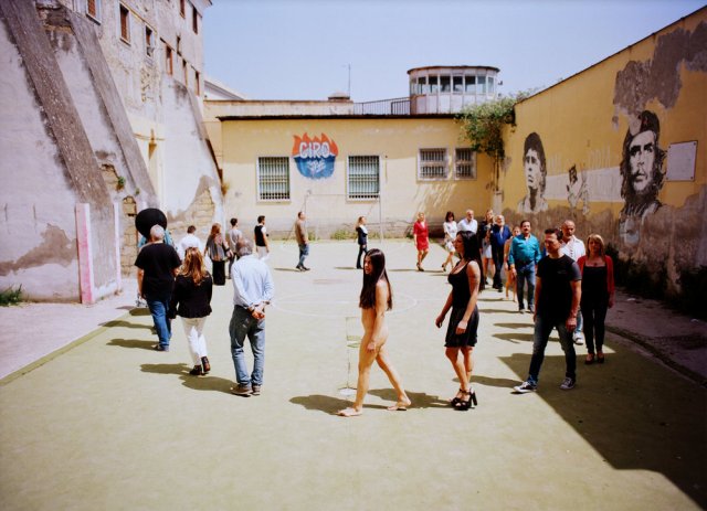 C’est cet univers festif, bachique, qui se déroule dans Luna Park : des corps différents se retrouvent tous ensemble à l’intérieur de l’ancien parc d’attractions de L’Edelandia à Naples. Après une longue procession dans laquelle défilent tous ensemble : femmes, hommes, transsexuels, personnes à mobilités différentes, migrants, malades, etc., ils finissent assis sur un manège dont les sièges volants font disparaître le cortège vers le haut, vers le ciel. Dans la deuxième action filmée, la communauté LGBTQ napolitaine tourne en rond à l’intérieur d’une ancienne prison pour malades mentaux à Naples. Cette fois, après l’ascension, les corps reviennent les pieds sur terre, avec leurs difficultés du quotidien et dans les marges d’une société qui les exclut. Si dans le sud de l’Italie le rituel et les traditions donnent l’effet du partage, de l’acceptation et de l’intégration de l’autre, en réalité, dans le quotidien la diversité reste en marge de la société, elle ne s’intègre pas et se bat tous les jours pour se justifier elle-même.