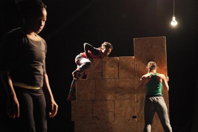 Viendra le moment jubilatoire où deux femmes noires, portant à bout de bras la blanche à l’horizontale, fracasseront dans le même élan le mur des divisions. Dès lors, les rires vont envahir l’espace traversé par des courses folles. « Faisant face » au public, elles forment une chaîne humaine avant de s’élancer de plus belle vers le premier mur qu’elles abattent sous l’effet de leurs énergies complices. Contemplant leur incroyable œuvre, transcendées par une euphorie jouissive, elles s’empareront des cubes formant le second mur pour se les lancer un à un, avant de former un « tableau vivant ». Juchée sur le plus haut cube, la femme noire à la pose hiératique regarde fièrement droit vers l’horizon, alors que les autres danseuses, agenouillées à ses pieds, n’ont d’yeux que pour la Femme advenue. Ecce Femina !