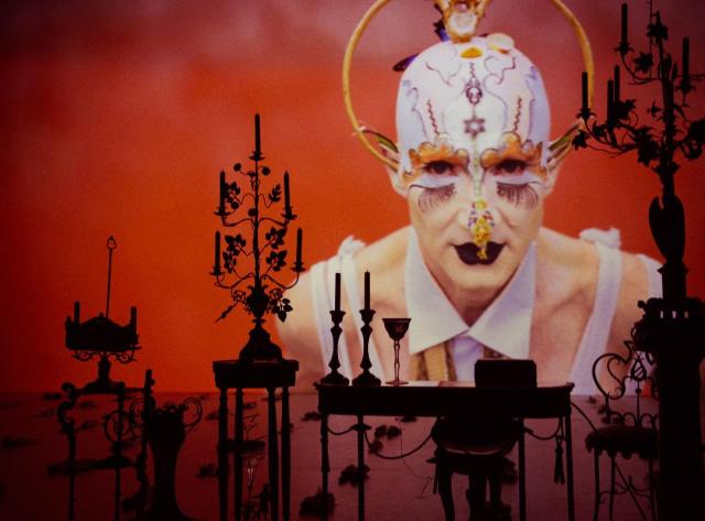 Comme une promesse inscrite en sa chair d’homme (il y a longtemps que Steven Cohen fait profession de foi artistique de son corps « traité » comme une œuvre à part entière), une vidéo en fond de scène projette en gros plan les lettres noires inscrites sur la plante de l’un de ses pieds livré au savoir-faire du tatoueur. S’y détache la calligraphie du titre éponyme. En surimpression, les images suivantes dévoilent le performer juché sur des cothurnes imposants reposant eux-mêmes sur deux cercueils à taille d’enfant. Dans cet équipage, revêtu d’une tunique immaculée, il émerge des fumerolles pour, prenant appui sur des béquilles échasses, s’avancer en titubant tant la marche lui est rendue difficile par son attirail. En gros plan, son visage d’où émergent d’immenses cils, des peintures graciles imitant la légèreté de papillons zélés, et un diadème surplombant un crâne chauve dominant des lèvres surlignées d’ébène, nous fixe comme pour nous entraîner dans le trip onirique d’une orgie vénitienne tant son regard fascinant nous extrait de nous-mêmes.