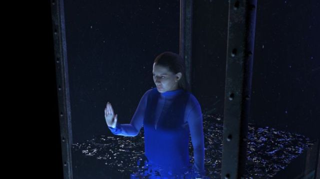 Le film vidéo « Rising » est donné en contrepoint d’un dispositif en réalité augmentée qui permet au spectateur de se déplacer virtuellement dans un espace où l’avatar d’Abramović est enfermé dans un aquarium se remplissant lentement, figurant symboliquement l’élévation inéluctable du niveau des eaux dans les océans.