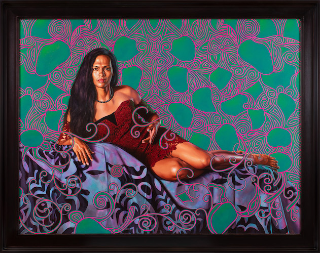 Wiley’s new works are focused on Tahiti’s Māhū community, the traditional Polynesian classification of people of a third gender, between male and female. The Māhū were highly respected within their society until they were banned by Catholic and Protestant missionaries. Wiley’s portraits of beautiful, transgender Tahitian women reference and confront Paul Gauguin’s celebrated works, which also feature subjects from the transgender community, but are fraught with historical undertones of colonialism and sexual objectification. Building off of Wiley’s earlier portraits that addressed issues of masculine identity and virility, these new portraits explore issues of identity through the lens of transformation, exploring both artifice and artificiality as a trans-cultural phenomenon.